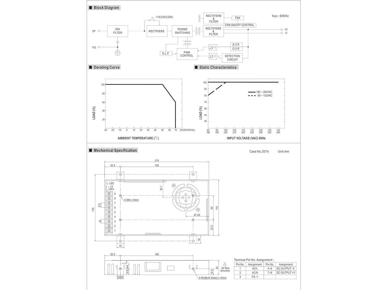 - Input Voltage Range: 90 ~ 132VAC / 180 ~ 264VAC by Switch;