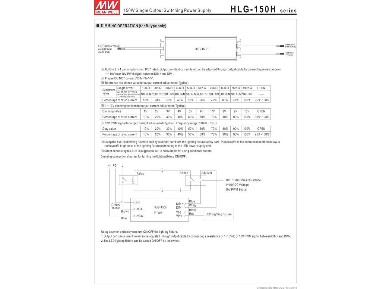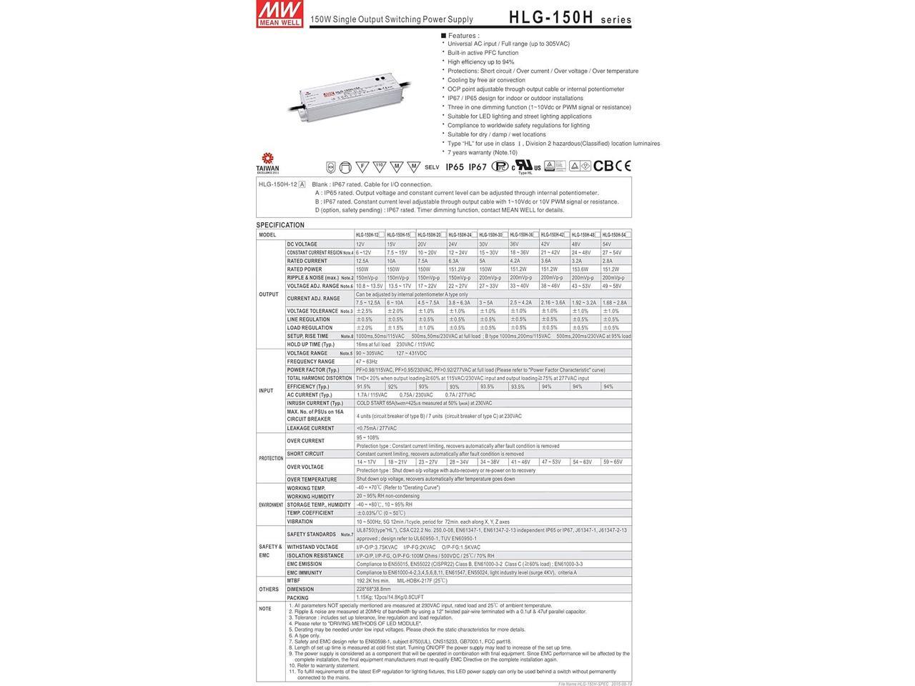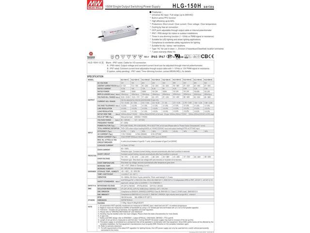MW Mean Well HLG-150H-42A 42V 3.6A 150W Single Output LED Switching Power Supply