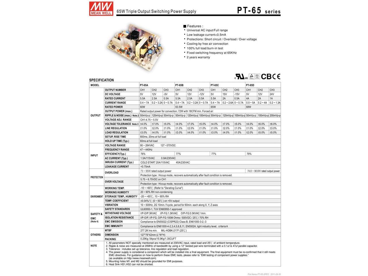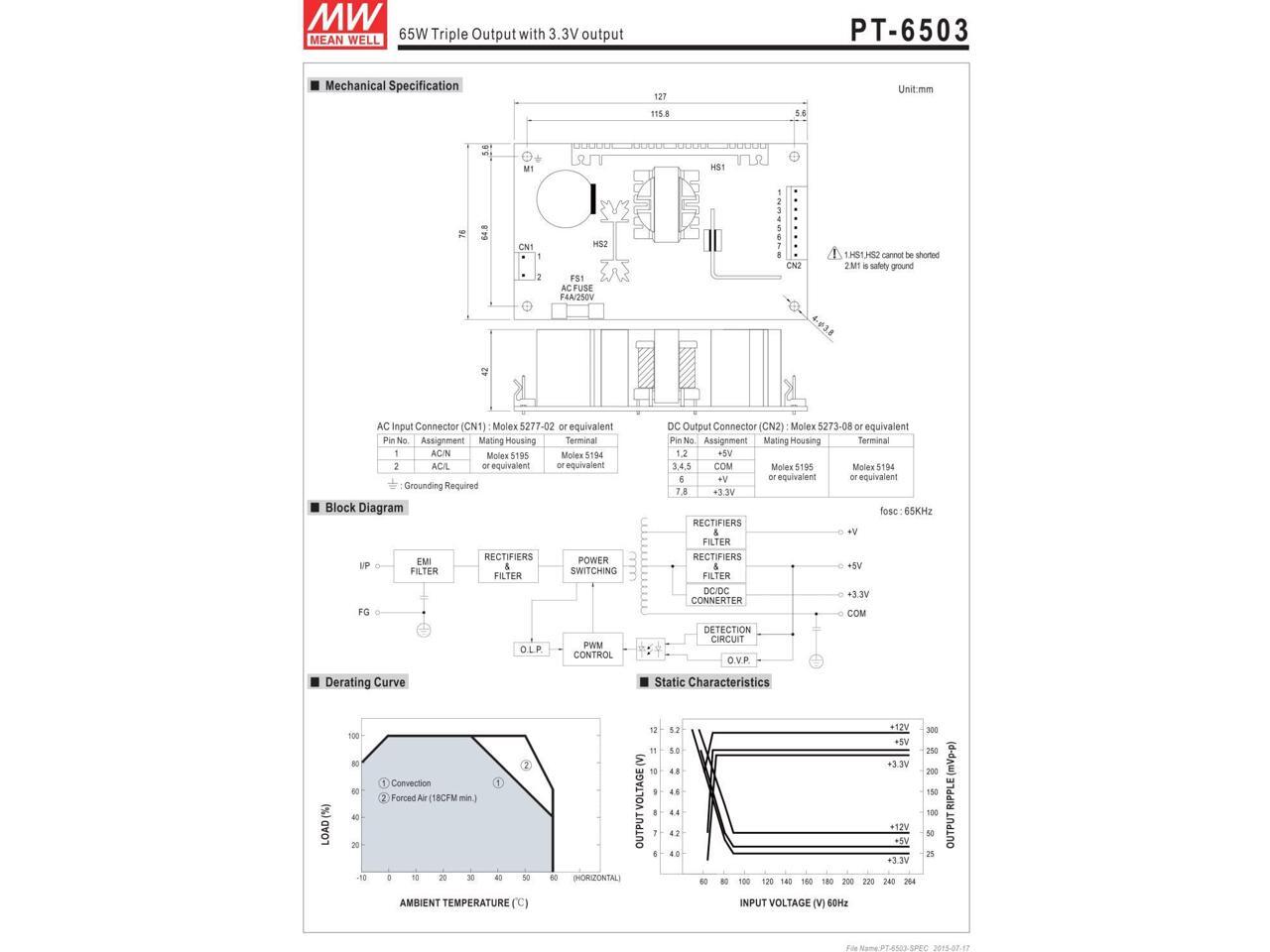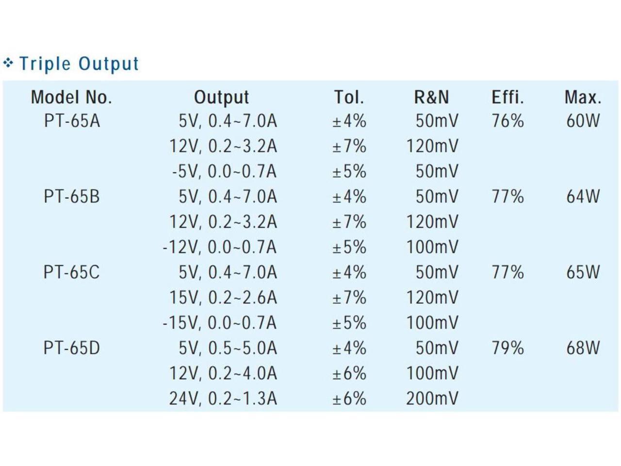 Industrial Open Frame 65W PT-65C Meanwell AC-DC Triple Output PT-65 Series MEAN WELL Switching Power Supply