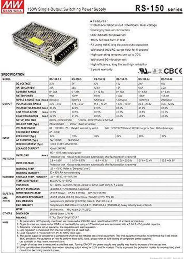 Output 150W 15V 10A. Actual inventory and quick shipment. Typical Standard shipping is about 7-12 days, more than 2kg possible ship by DHL / FEDEX about 3-5 days.