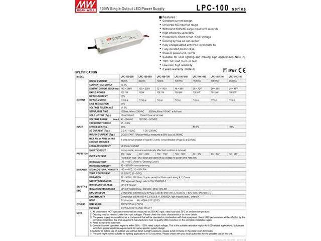 LED Driver 100.1W 286V 350mA LPC-100-350 Meanwell AC-DC SMPS LPC-100 Series MEAN WELL C.C Power Supply