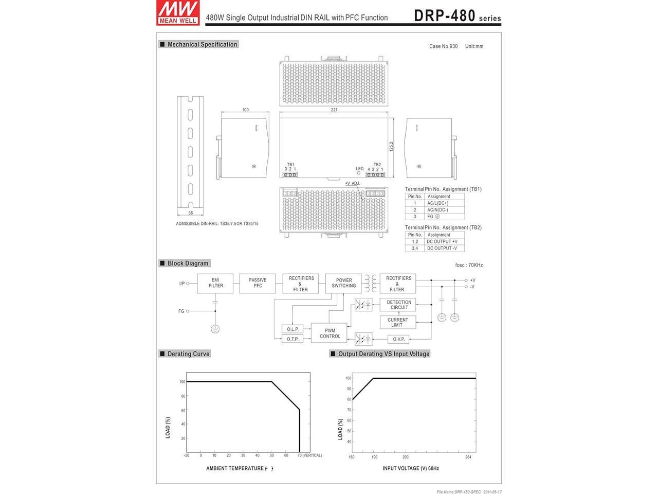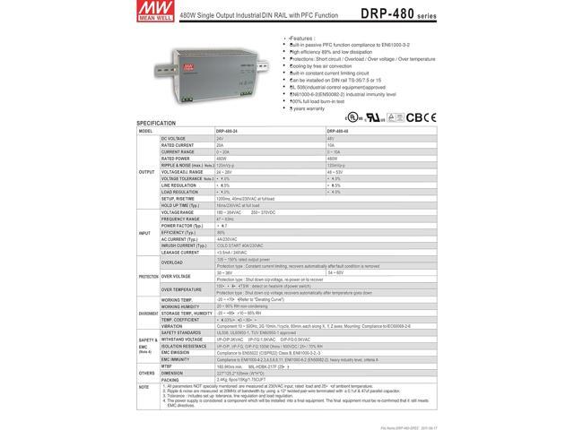 MW Mean Well DRP-480-24 24V 20A 480W Single Output Industrial DIN RAIL with PFC Function Power Supply