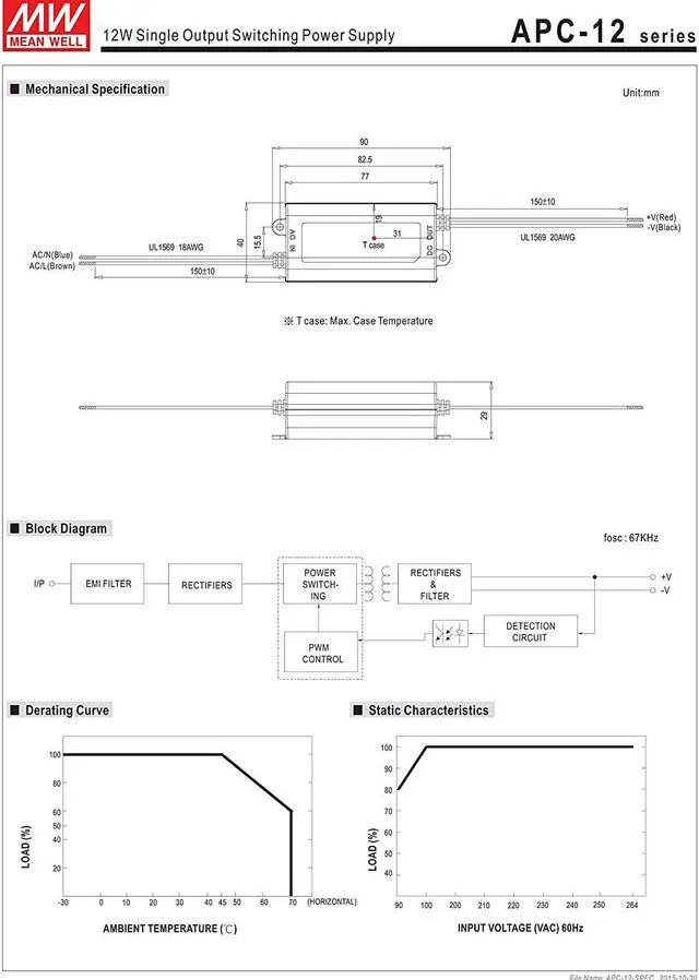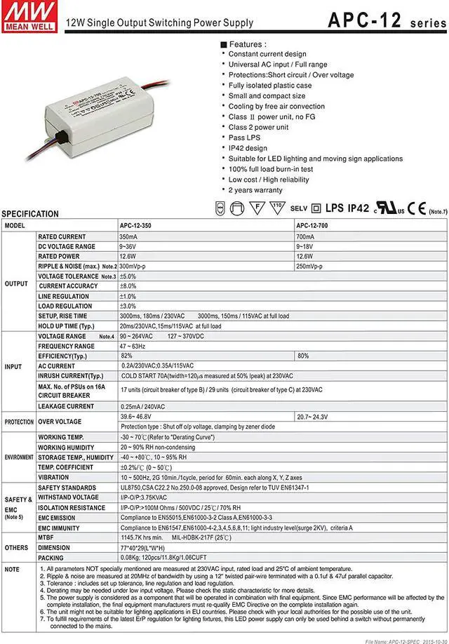 94V-0 flame retardant plastic case Class 2 power unit / Pass LPS (except for APC-8, APC-25-350 & APC-35-350/500)