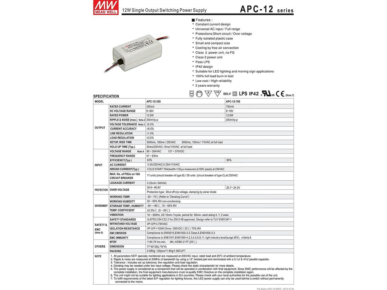 MW Mean Well APC-12-700 18V 700mA 12W Single Output LED Switching Power Supply