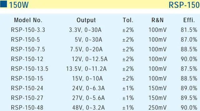 Protections: Short circuit / Overload / Over voltage / Over temperature (RSP-100/150/200)