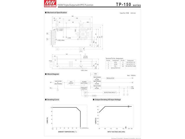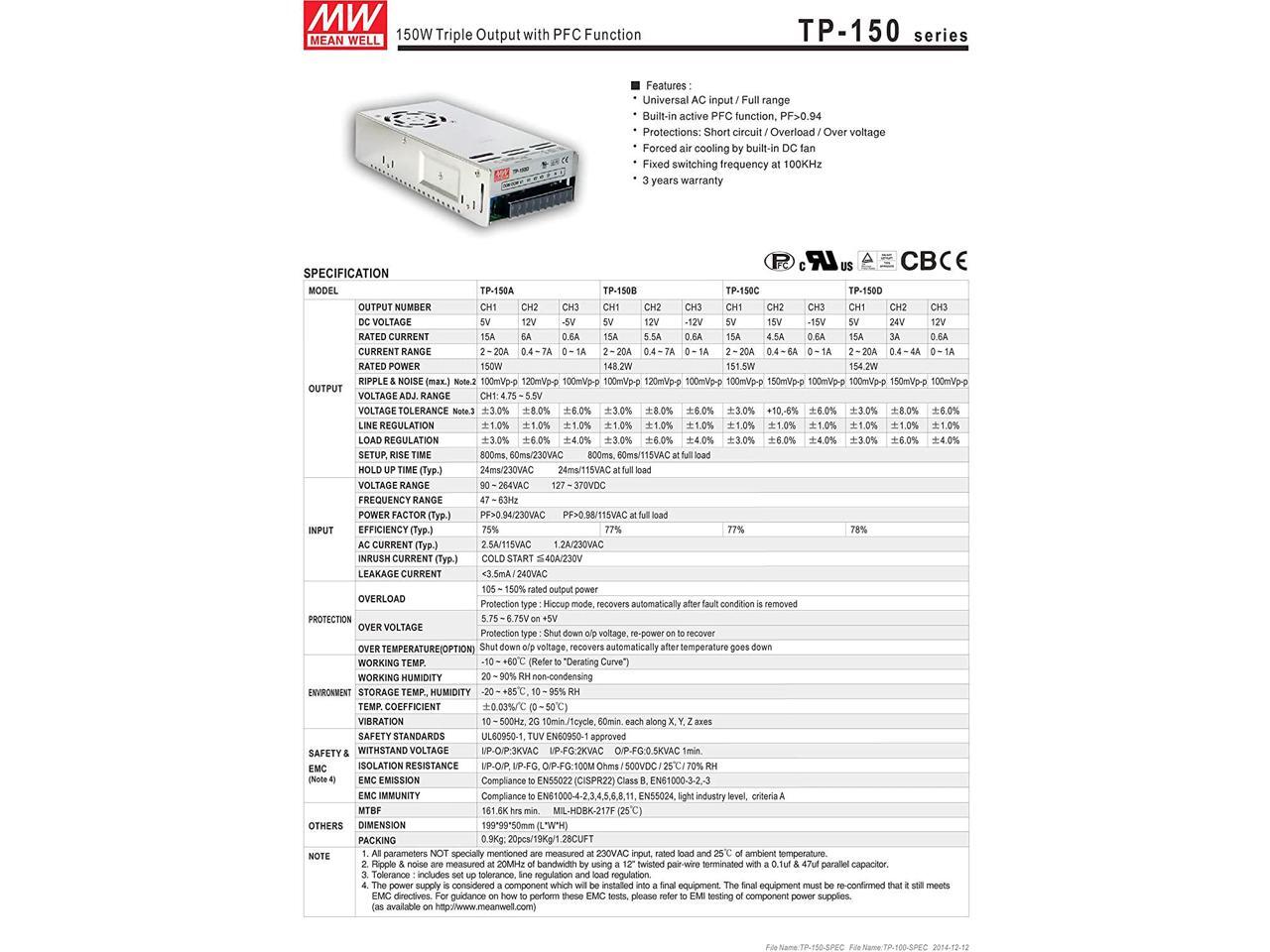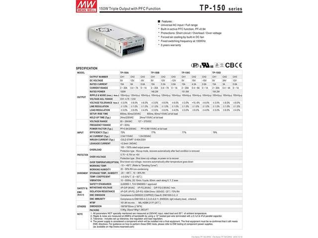 Mean Well Original TP-150B Triple Output with PFC Function Power Supply +/-12V 5V 0.6A 5.5A 15A 148W