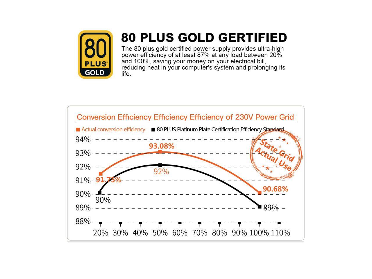 - 80 PLUS GOLD Certified: The 750 Watt Power Supply 80 Plus Gold provides ultra-high power efficiency of 91.8% at typical load, reducing heat in your computer's system and prolonging its life.