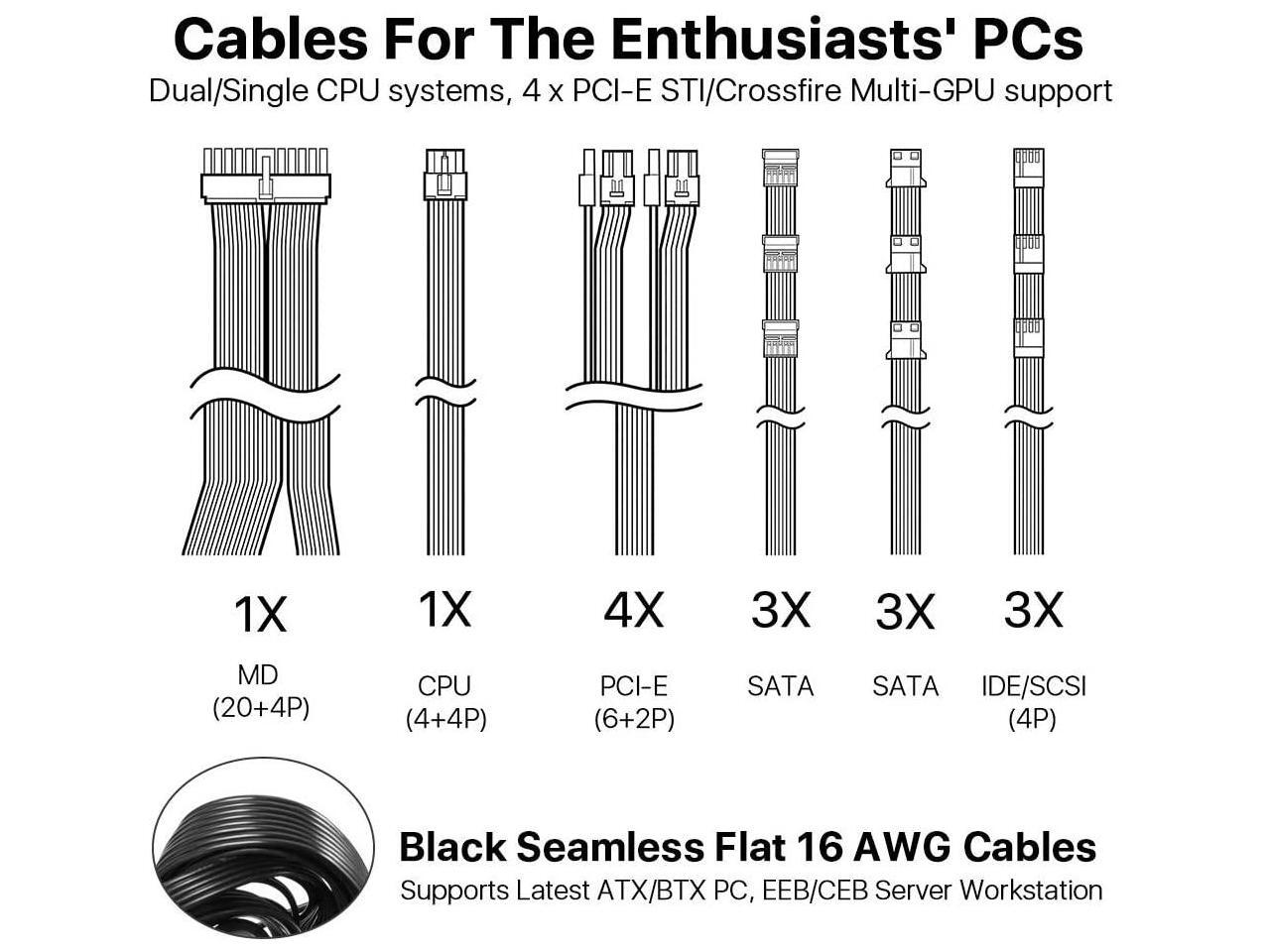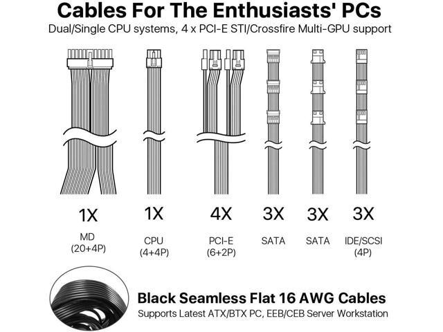 - 16AWG Wires & Connectors for Performance - EPS 8-pin +12V supports dual CPU and latest single CPU systems; 4 x PCIE cables for the enthusiasts' PCs, allowing STI/Crossfire GPU support; 6 x SATA power cables support latest hard drive devises; 3x Standard 4-pin peripheral; EPS 24-pin motherboard power supply supports Latest ATX/BTX PC, EEB/CEB Server Workstation