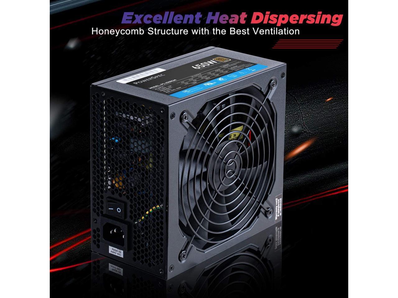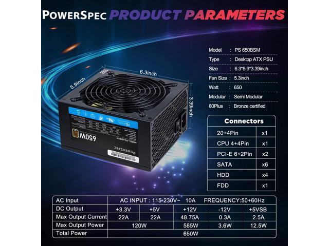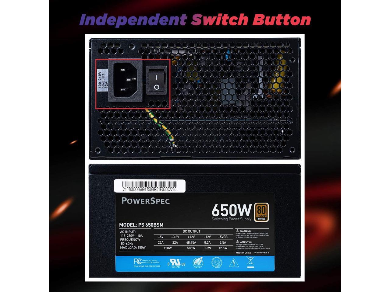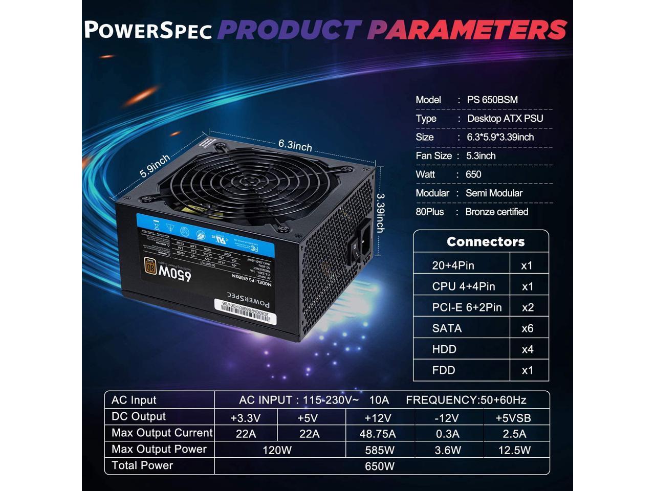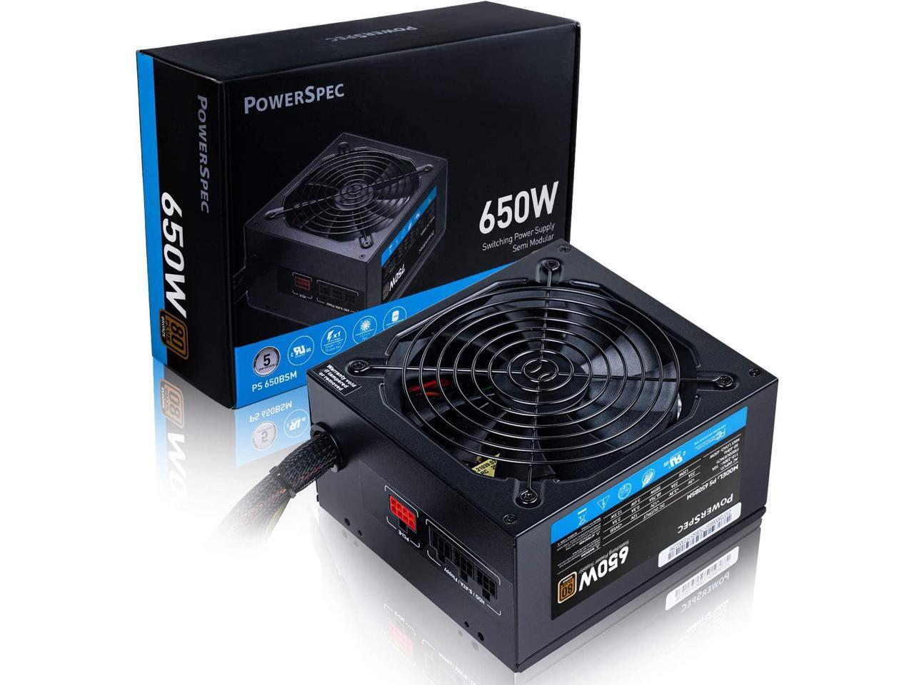 PowerSpec 650W Power Supply Semi Modular 80 Plus Bronze Certified ATX PSU Active PFC SLI Crossfire Ready Gaming PC Computer Switching Power Supply, PS 650BSM