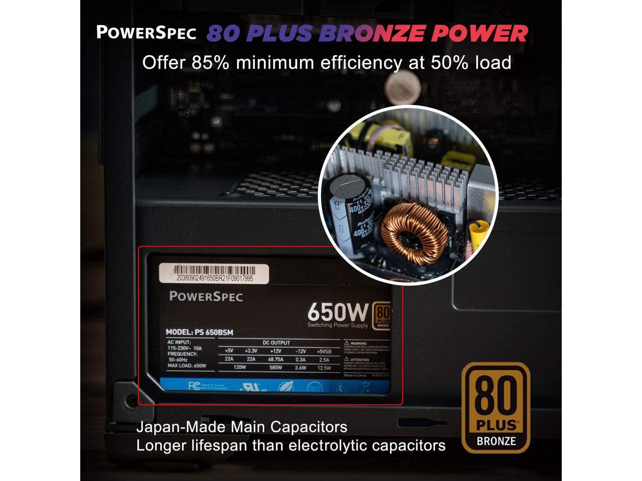 - UL & 80+ BRONZE CERTIFIED: The PowerSpec semi-modular power supply has an 80 Plus Bronze and UL certification. 80+ Bronze boasts an 85% minimum efficiency at 50% load. This PSU is also certified by a nationally recognized Underwriter Laboratory for various safety and sustainability tests