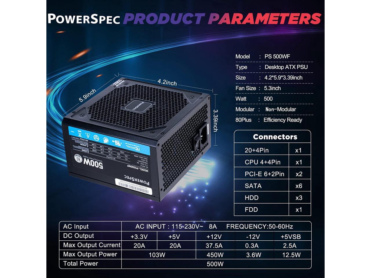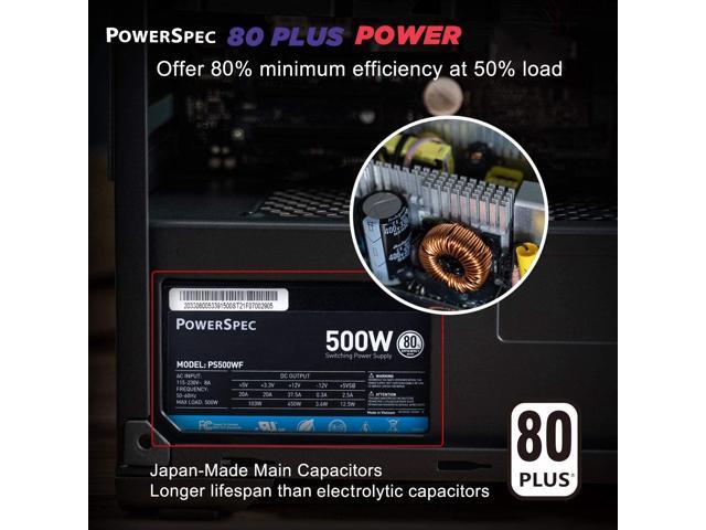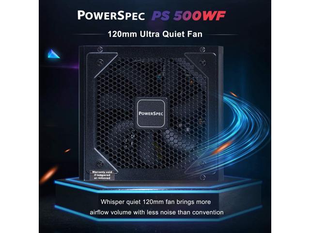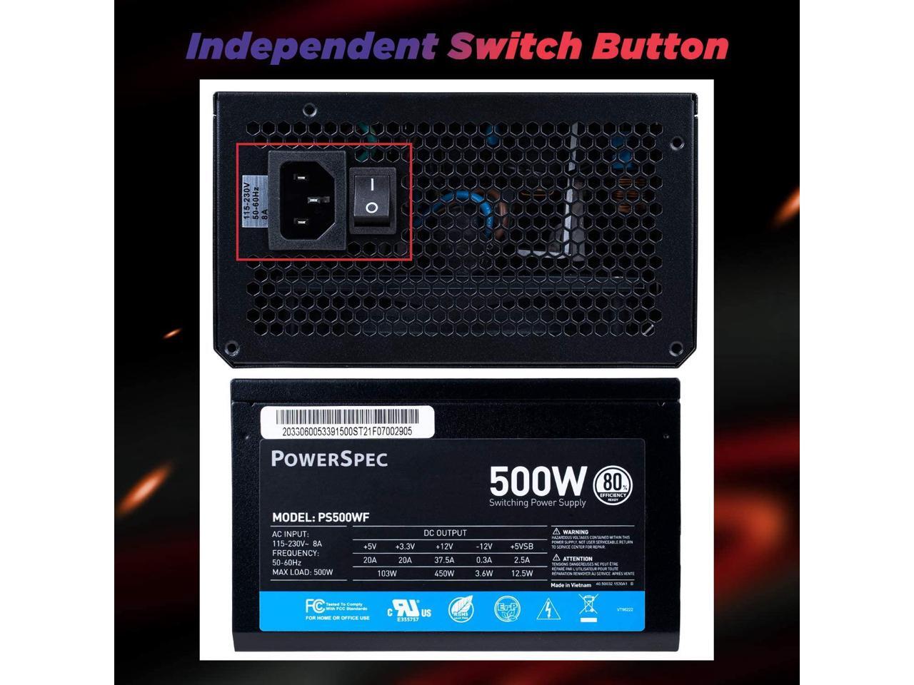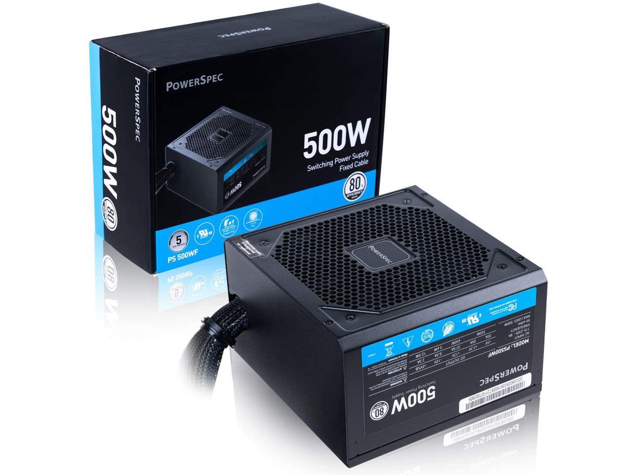 PowerSpec 500W Power Supply 80 Plus Certified Fixed Cable Non-Modular ATX PSU Active PFC SLI Crossfire Ready Gaming PC Computer Switching Power Supply, PS500WF