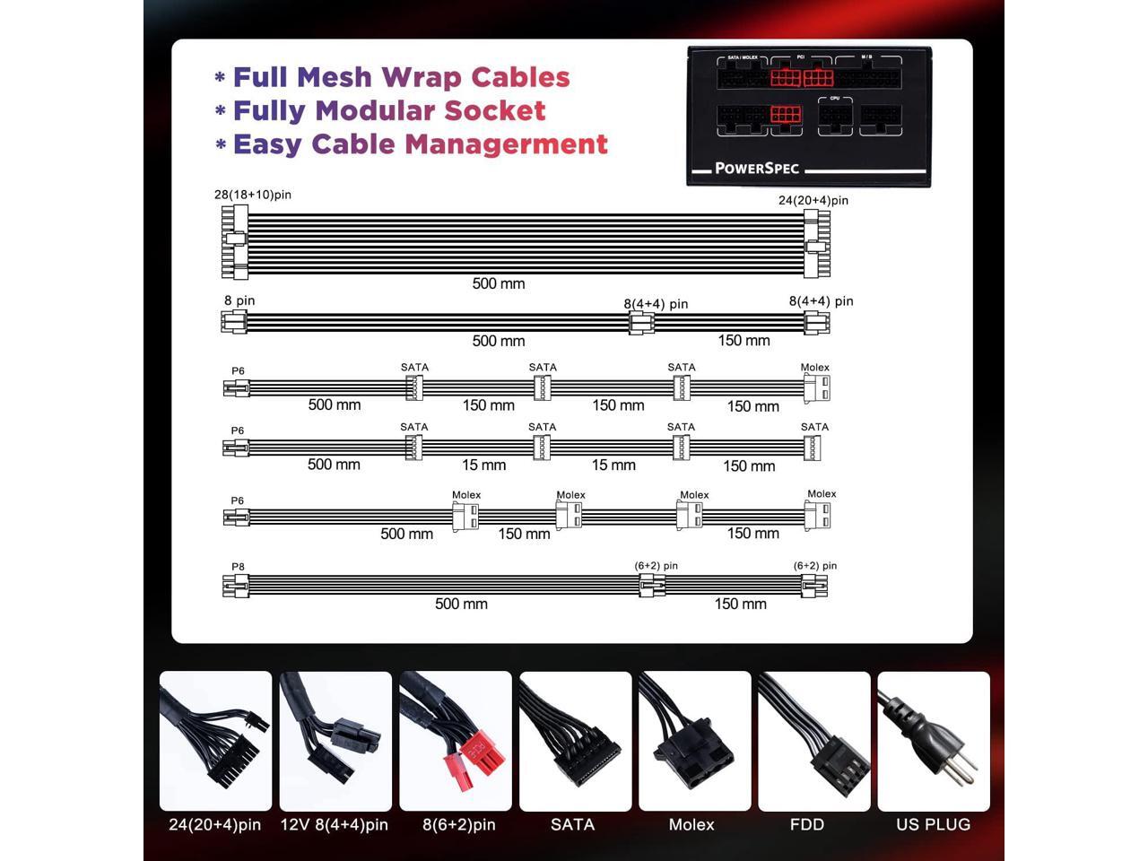 FULLY MODULAR PSU The space-saving modular cabling system of this PowerSpec modular power supply makes installation and cable management simpler. Using only the cables you need will help reduce clutter and enhance airflow. Low-profile nylon sleeve cables gain a professional build