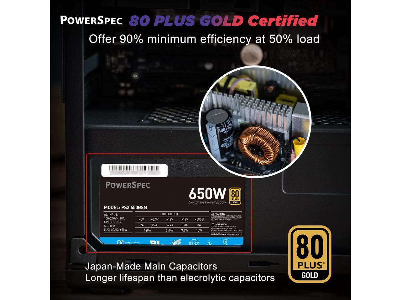 - UL & 80+ GOLD CERTIFIED: The PowerSpec semi-modular power supply has an 80 Plus Gold and UL certification. 80+ Gold boasts an 90% minimum efficiency at 50% load. This PSU is also certified by a nationally recognized Underwriter Laboratory for various safety and sustainability tests