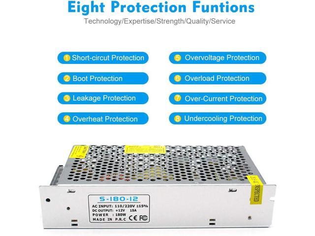 - Universal Input: 100-240V AC; Output: 12V DC 15A