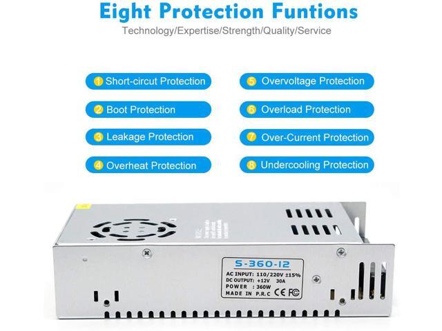 - Universal Input: 100-240V AC; Output: 12V DC 30A