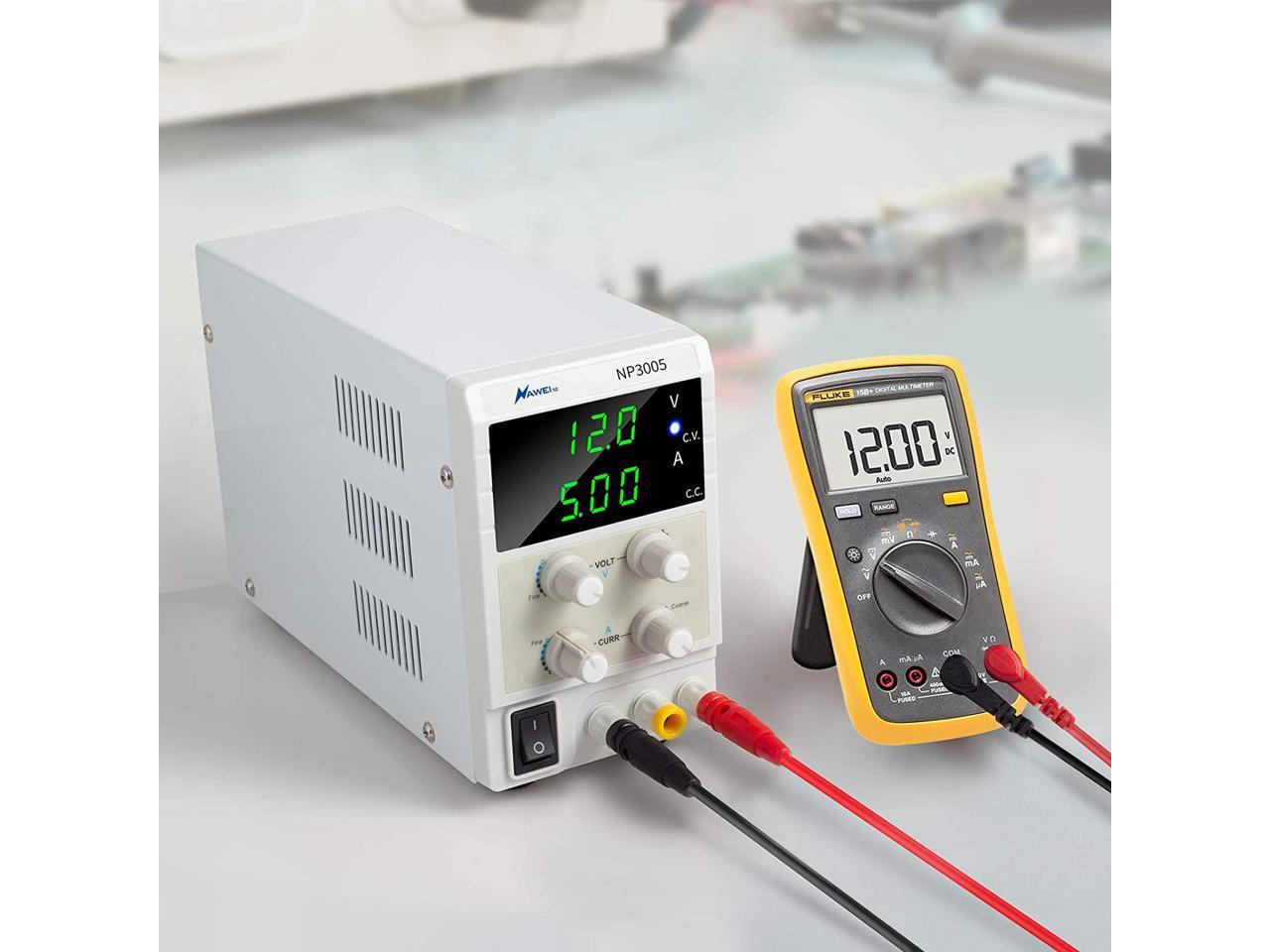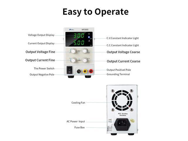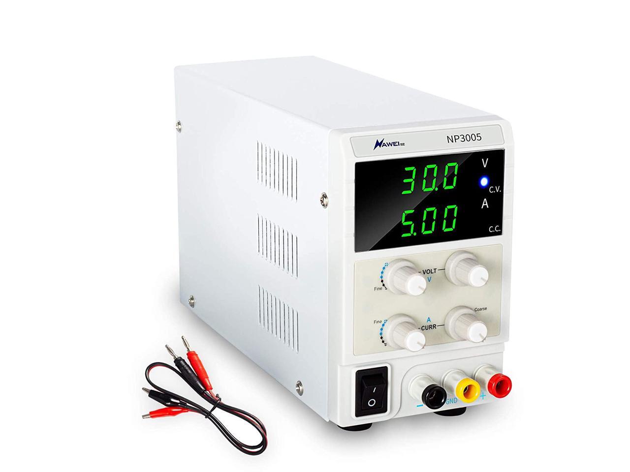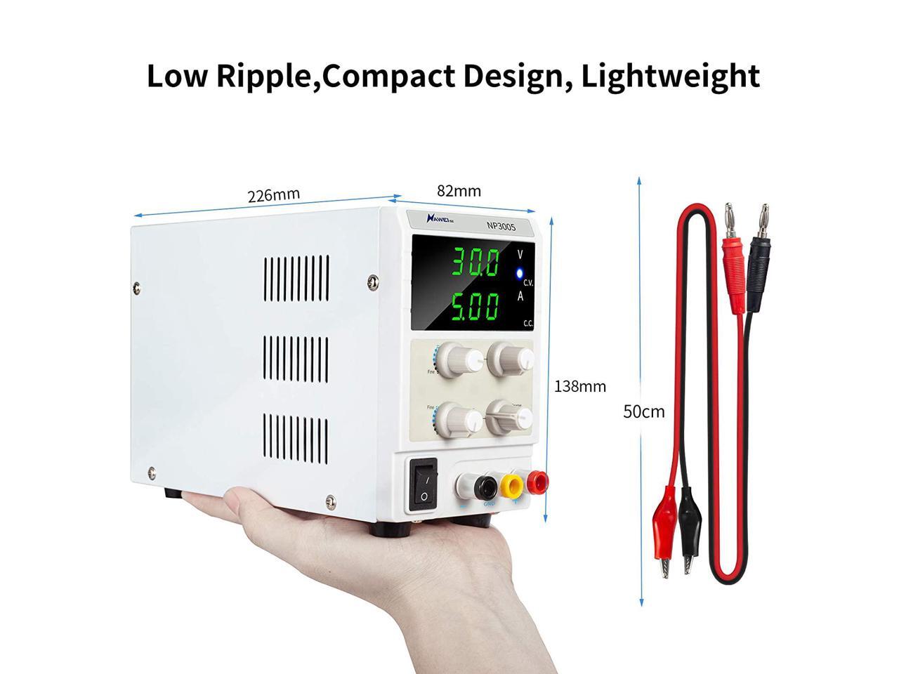 - DC Bench Power Supply Regulated Adjustable: 0-30 volts and 0-5 amp outputs; the Back-lit 3-digit LED Display accuracy: 0.1 V and 0.01A