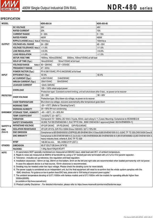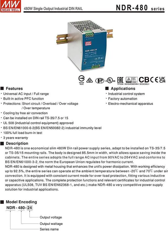 Mean Well NDR-480-24 AC to DC DIN-Rail Power Supply,Single Output Industrial Power Supply 24V20A 480W