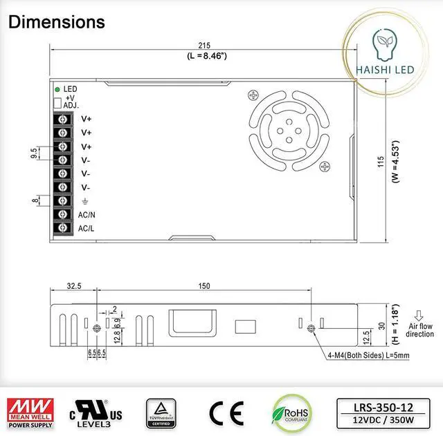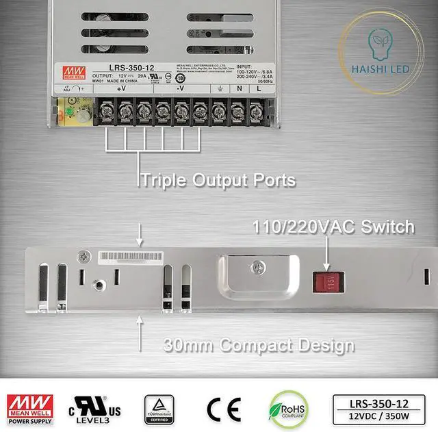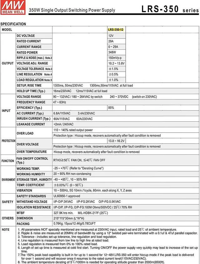 LRS-350-12 is a 350W single-output enclosed type power supply with 30mm of low profile design. Adopting the input of 115VAC or 230VAC (select by switch), provides an output of voltage of 12VDC.