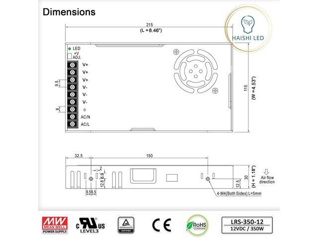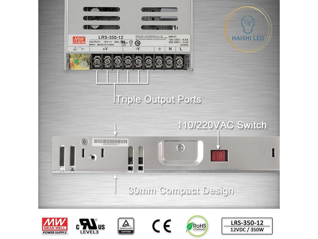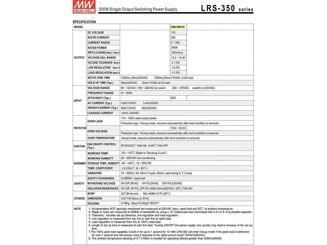 MeanWell Compact Design, 12VDC Switching Power Supply, Active Cooling, LRS-350-12, 110VAC / 220VAC Switchable (350 Watt)