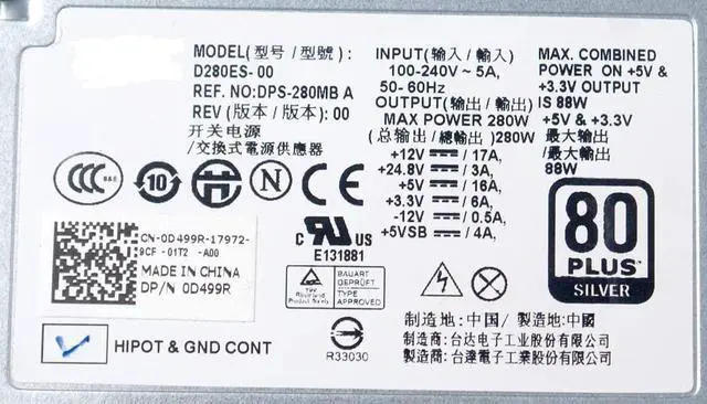 Input: 100-240V, Output: 280w Max, Dell Part Numbers: D499R, KD98N, Y738P, Model Numbers: D280ES-00, PS-6281-9DA