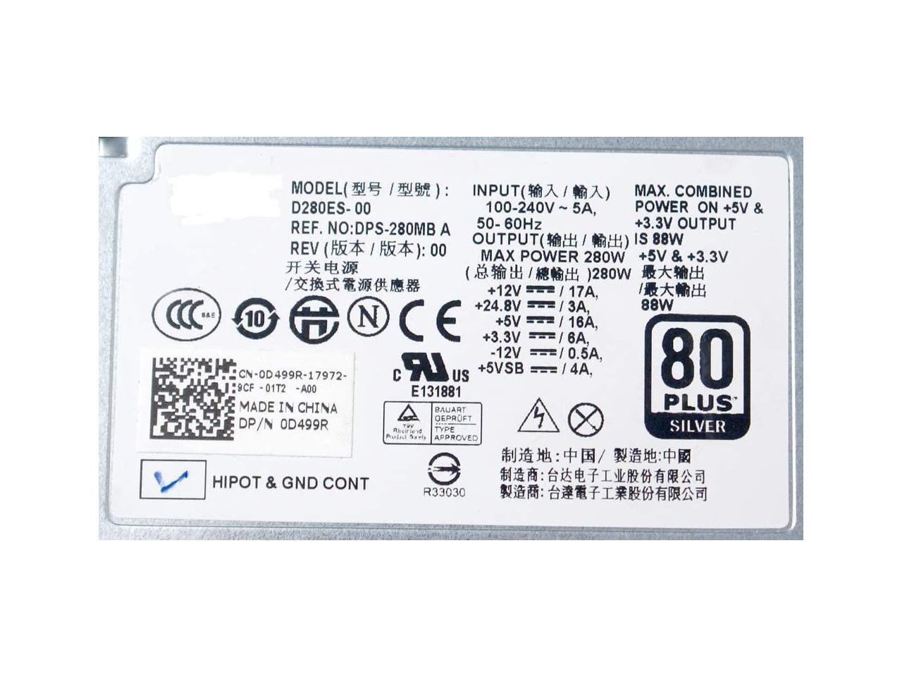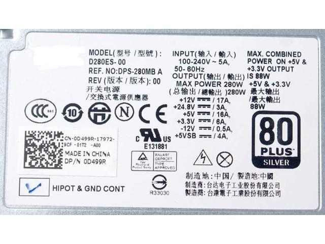 - Input: 100-240V, Output: 280w Max, Dell Part Numbers: D499R, KD98N, Y738P, Model Numbers: D280ES-00, PS-6281-9DA