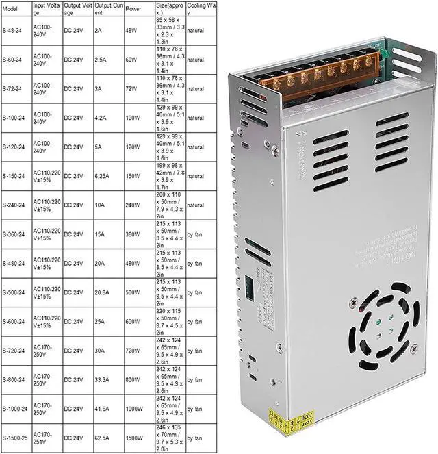 Model Input Voltage Output Voltage Output Current Power Size(approx.) Cooling Way S-48-24 AC100-240V DC 24V 2A 48W 85 x 58 x 33mm / 3.3 x 2.3 x 1.3in natural S-60-24 AC100-240V DC 24V 2.5A 60W 110 x 78 x 36mm / 4.3 x 3.1 x 1.4in natural S-72-24 AC100-240V DC 24V 3A 72W 110 x 78 x 36mm / 4.3 x 3.1 x 1.4in natural S-100-24 AC100-240V DC 24V 4.2A 100W 129 x 99 x 40mm / 5.1 x 3.9 x 1.6in natural S-120-24 AC100-240V DC 24V 5A 120W 129 x 99 x 40mm / 5.1 x 3.9 x 1.6in natural S-150-24 AC110/220V±15% DC 24V 6.25A 150W 199 x 98 x 42mm / 7.8 x 3.9 x 1.7in natural S-240-24 AC110/220V±15% DC 24V 10A 240W 200 x 110 x 50mm / 7