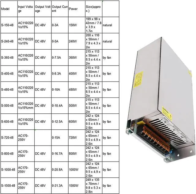 Product Parameter Comparison Table: Model Input&Nbsp;Voltage Output&Nbsp;Voltage Output&Nbsp;Current Power Size(Approx.) Cooling&Nbsp;Way&Nbsp; S150-48 Ac110/220V?à15% Dc&Nbsp;48V 0-3A 150W 199 X 98 X 42Mm / 7.8 X 3.9 X 1.7In Natural S240-48 Ac110/220V?à15% Dc&Nbsp;48V 0-5A 240W 200 X 110 X 50Mm / 7.9 X 4.3 X 2In Natural S360-48 Ac110/220V?à15% Dc&Nbsp;48V 0-7.5A 360W 215 X 113 X 50Mm / 8.5 X 4.4 X 2In By&Nbsp;Fan S-400-48 Ac110/220V?à15% Dc&Nbsp;48V 0-8.3A 400W 215 X 113 X 50Mm / 8.5 X 4.4 X 2In By&Nbsp;Fan S-480-48 Ac110/220V?à15% Dc&Nbsp;48V 0-10A 480W 215 X 113 X 50Mm / 8.5 X 4.4 X 2In By&Nbsp;Fan S-500-48 Ac110/220V?à15%Mm Dc&Nbsp;48V 0-10.4A 500W 215 X 1