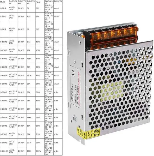 Model Input Voltage Output Voltage Output Current Power Size(approx.) Cooling Way S-36-12 AC100-240V DC 12V 3A 36W 85 x 58 x 33mm / 3.3 x 2.3 x 1.3in natural S-50-12 AC100-240V DC 12V 4.2A 50W 110 x 78 x 36mm / 4.3 x 3.1 x 1.4in natural S-60-12 AC100-240V DC 12V 5A 60W 85 x 58 x 33mm / 3.3 x 2.3 x 1.3in(small) natural 110 x 78 x 36mm / 4.3 x 3.1 x 1.4in(big) S-100-12 AC100-240V DC 12V 8.5A 100W 129 x 99 x 40mm / 5.1 x 3.9 x 1.6in natural S-120-12 AC100-240V DC 12V 10A 120W 129 x 99 x 40mm / 5.1 x 3.9 x 1.6in natural S-150-12 AC110/220V±15% DC 12V 12.5A 150W 199 x 98 x 42mm / 7.8 x 3.9 x 1.7in natural S-180-12 AC110/220V±15% DC 12V 15A 180W 199 x 98 x 42mm / 7.8 x 3.9 x 1.7in natural S-200-12 AC110/