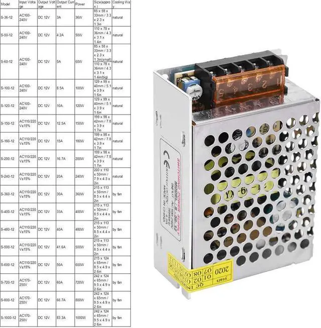 Model Input Voltage Output Voltage Output Current Power Size(approx.) Cooling Way S-36-12 AC100-240V DC 12V 3A 36W 85 x 58 x 33mm / 3.3 x 2.3 x 1.3in natural S-50-12 AC100-240V DC 12V 4.2A 50W 110 x 78 x 36mm / 4.3 x 3.1 x 1.4in natural S-60-12 AC100-240V DC 12V 5A 60W 85 x 58 x 33mm / 3.3 x 2.3 x 1.3in(small) natural 110 x 78 x 36mm / 4.3 x 3.1 x 1.4in(big) S-100-12 AC100-240V DC 12V 8.5A 100W 129 x 99 x 40mm / 5.1 x 3.9 x 1.6in natural S-120-12 AC100-240V DC 12V 10A 120W 129 x 99 x 40mm / 5.1 x 3.9 x 1.6in natural S-150-12 AC110/220V±15% DC 12V 12.5A 150W 199 x 98 x 42mm / 7.8 x 3.9 x 1.7in natural S-180-12 AC110/220V±15% DC 12V 15A 180W 199 x 98 x 42mm / 7.8 x 3.9 x 1.7in natural S-200-12 AC110/