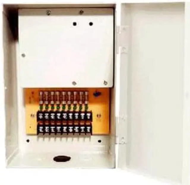 DV-AT1209A-D9P is a Power Supply box for CCTV . It has 9 Port Power Box with DC 12V , 7Amp PTC output . It is designed for Indoor use only . Input Power: AC 115V,60Hz . Output Power: 12VDC 9A Output . PTC Protection: each output LED Indicators: each output Output over-voltage protection Over-current protection Output short circuit protection