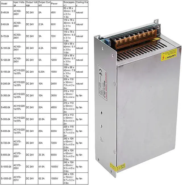 Model Input Voltage Output Voltage Output Current Power Size(approx.) Cooling Way S-48-24 AC100-240V DC 24V 2A 48W 85 x 58 x 33mm / 3.3 x 2.3 x 1.3in natural S-60-24 AC100-240V DC 24V 2.5A 60W 110 x 78 x 36mm / 4.3 x 3.1 x 1.4in natural S-72-24 AC100-240V DC 24V 3A 72W 110 x 78 x 36mm / 4.3 x 3.1 x 1.4in natural S-100-24 AC100-240V DC 24V 4.2A 100W 129 x 99 x 40mm / 5.1 x 3.9 x 1.6in natural S-120-24 AC100-240V DC 24V 5A 120W 129 x 99 x 40mm / 5.1 x 3.9 x 1.6in natural S-150-24 AC110/220V±15% DC 24V 6.25A 150W 199 x 98 x 42mm / 7.8 x 3.9 x 1.7in natural S-240-24 AC110/220V±15% DC 24V 10A 240W 200 x 110 x 50mm / 7
