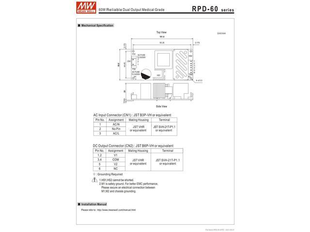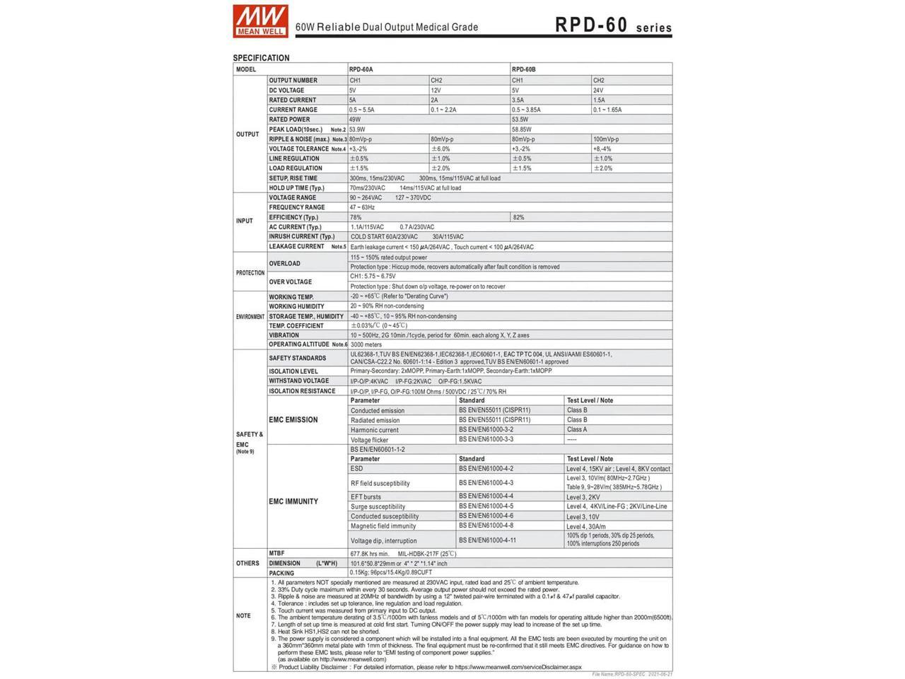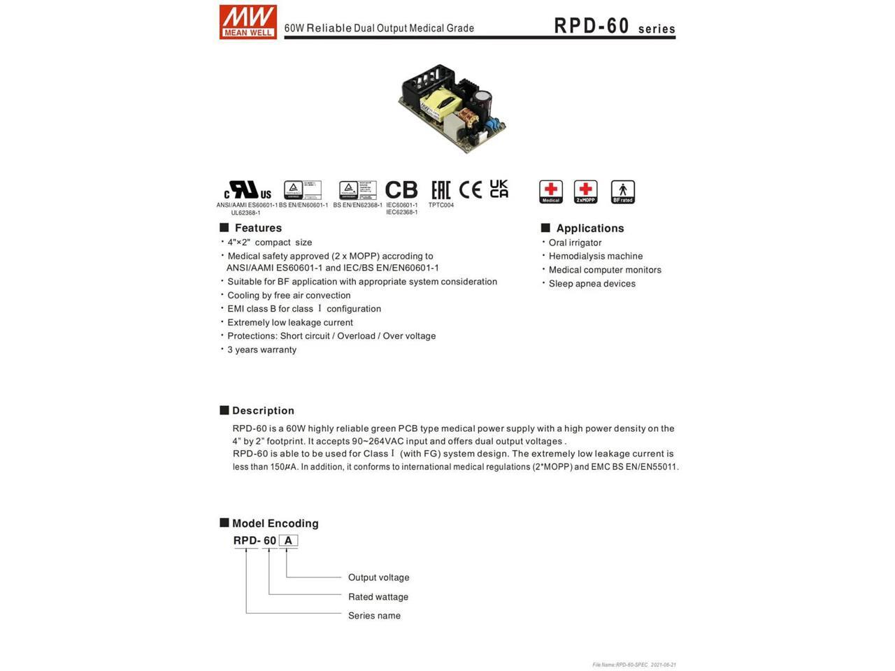 - The RPD-60 series conforms to international medical regulations (2*MOPP) and EMC BS EN/EN55011, is a 60W highly reliable green PCB type medical power supply