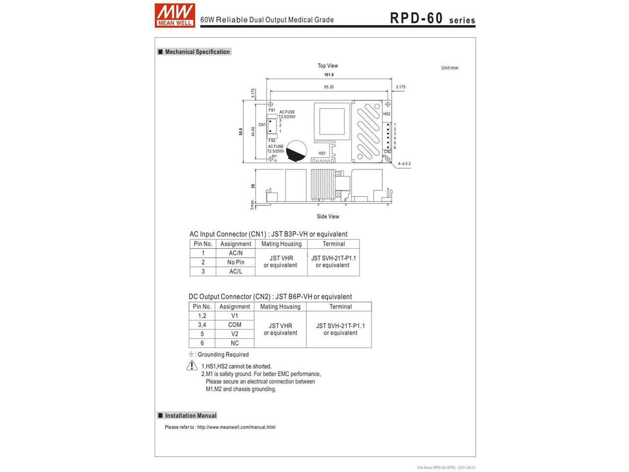 MW Mean Well Open Frame PCB Type Medical Power Supply RPD-60A/B 4" X 2" Dual Output Switching Power Supply Multi Output (RPD-60B)