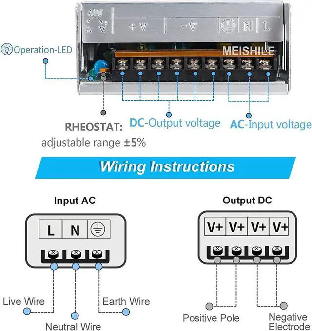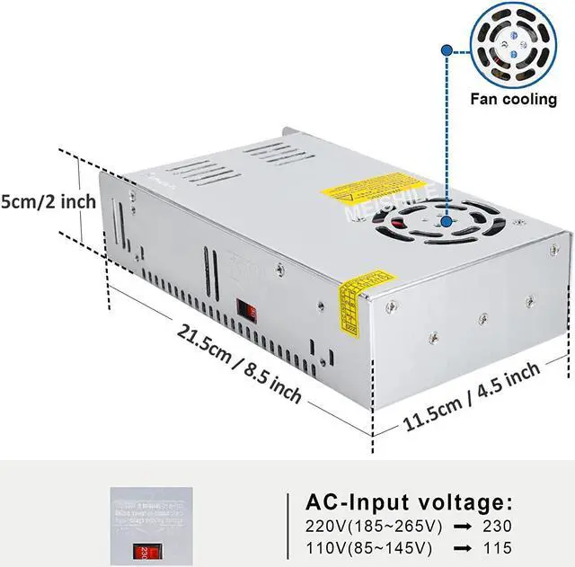 Main Parameter DC Output Range: 12V,041A Rated Power: 500W Input voltage: 110V/220V ±15%(95-126V / 185-250V) Range Of Difference:±1% Efficiency: >80% Output adjustable voltage range: ±3% Frequency: 50-60Hz Leakage current: <1mA/230V Temperature coefficient: ±0.03%/°CC050°CC Start, rise, hold time 200ms, 50ms, 20ms Seismic resistance: 10500Hz,2G 10min, /1 cycle, time 60 points, each axis Protection: overload, overvoltage, overcurrent, short circuit protection Pressure resistance between input and output 1.5KvAC input and shell; 1.5KvAC output and shell; 0.5KvAC The working temperature and humidity are between -10 and +60, and the temperature ranges from 20% to 90%RH The storage temperature and humidity are -20 ~ +85, 10% ~ 95%RH Product Size: 215*115*50mm Product Weight: 0.9kg Note: This product has a cooling fan to perform a sound (the sound of a fan rotates) Cautions: It s suggested that total power consumption of the loads to be connected be not more than 80% of the rate power of product