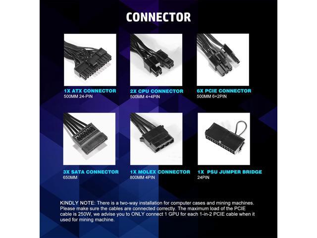 - Kindly Note: There is a two-way installation for computer cases and mining machines. Please make sure the cables are connected correctly. If you install the power supply on the motherboard without a 24Pin interface, please insert a 24Pin bridge into the port of the 24Pin power cord, then the power supply will start to work.