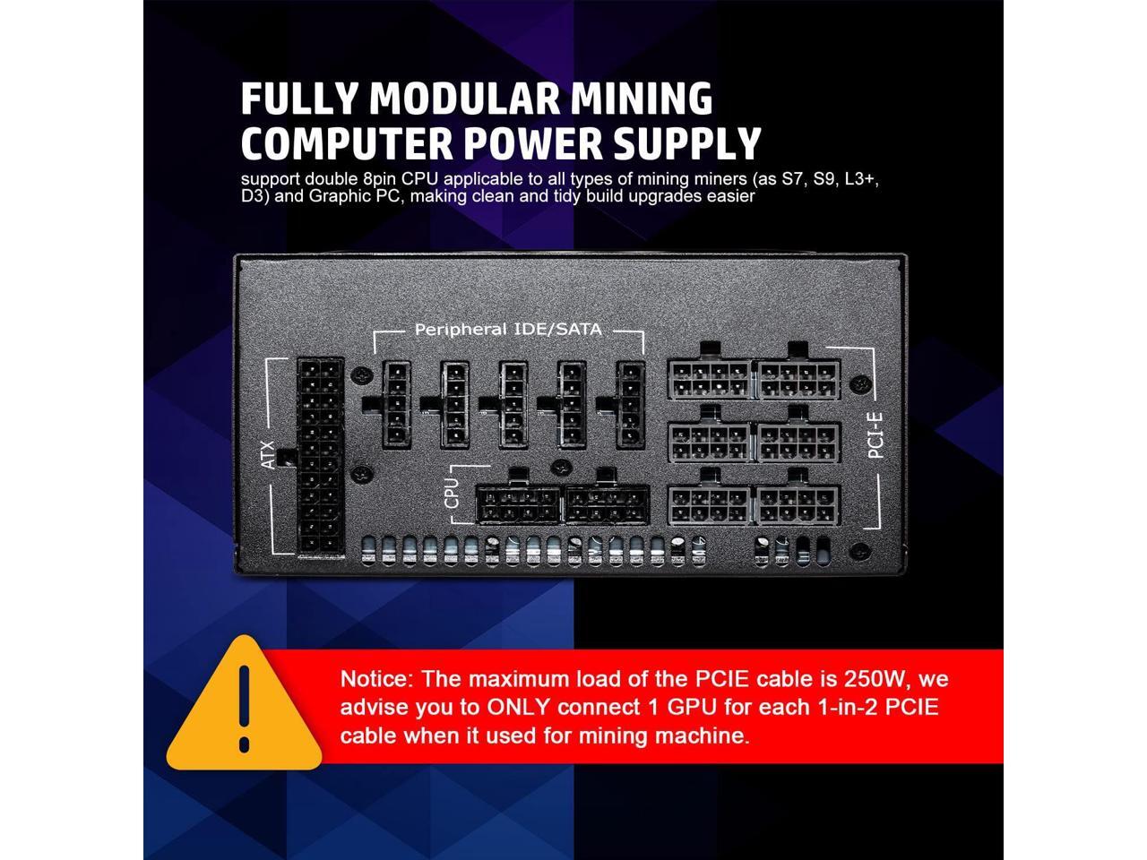 - Fully modular mining computer power supply: support double 8pin CPU applicable to all types of mining miners (as S7, S9, L3+, D3) and Graphic PC, making clean and tidy build upgrades easier.