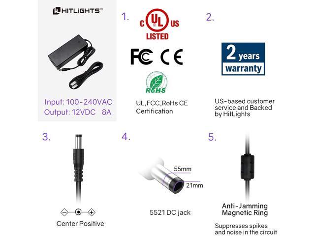 HitLights 12V 8A 96W DC Power Supply, UL Listed LED Power Adapter 120V AC to 12V DC Transformer for LED Strip Lights and More