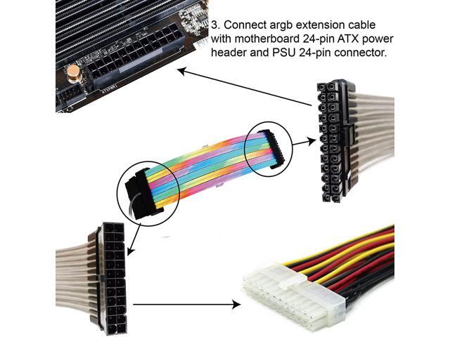- 24-Pin ATX RGB Cable Extension Kit24-pin ATX Addressable RGB PSU extension Kit, come with 25cm/9.8inches 18AWG PSU extension cable and 20cm/7.9inches sleeved neon addressable rgb led strips. Creat amazing RGB sync effects and more brighter, perfect for you DIY gamers to build up any color or animation you desired. And you can manage your case cables well to keep them tidy. At the same time maintain the stability of the power supply.