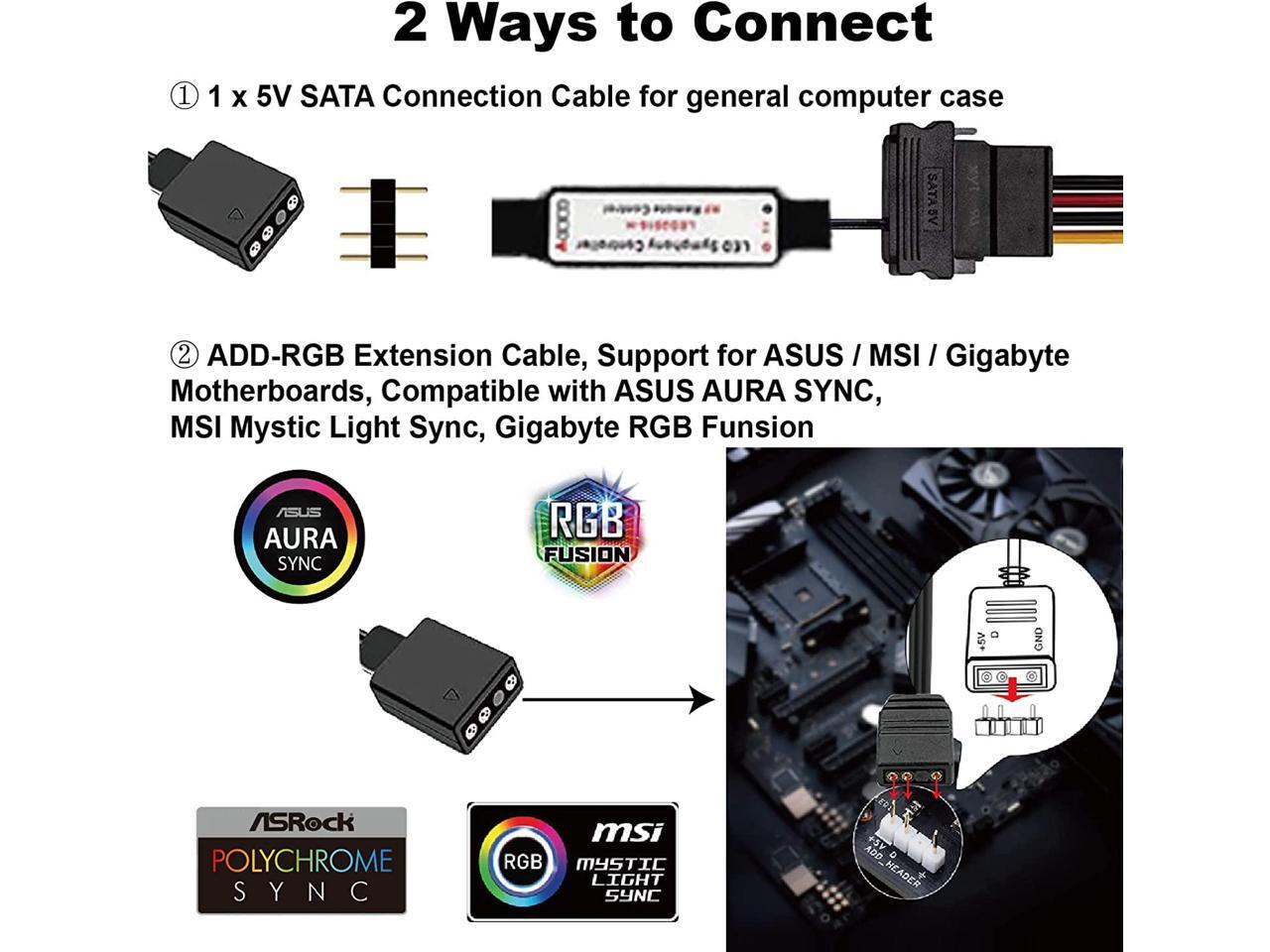 - 2-WAY TO CONTROLConnected by 5V ADD RGB 3-pin header on Motherboard with 3-pin Addressable RGB header(+5V, DATA, N/A, GND), compatible with Asus Aura, Gigabyte RGB Fusion, MSI Mystic Light, ASROCK RGB LED etc. Or using our rf controller with SATA connection , without worry n