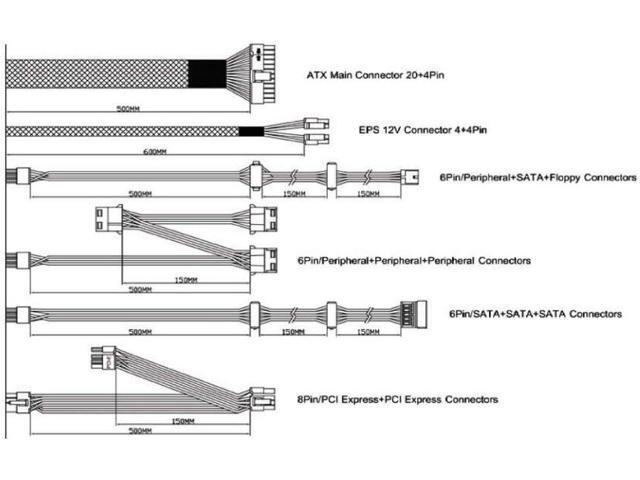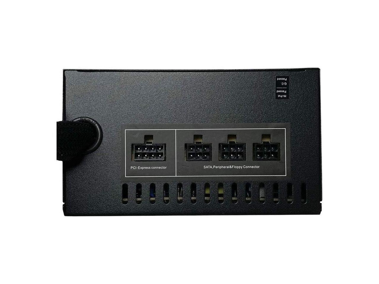 - Connectors : 1 x 20/24pin Main Power, 1 x 4+4pin 12V, 2 x PCI 6+2pin, 4 x SATA, 4 x Peripheral, 1 x Floppy