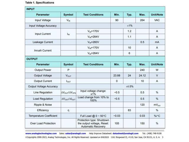 Analog Technologies ALRS24V10AT Versatile 240W Switching Power Supply Converts 110VAC/220VAC to 24VDC 10A for 3D Printers, Computers, and LED Lighting