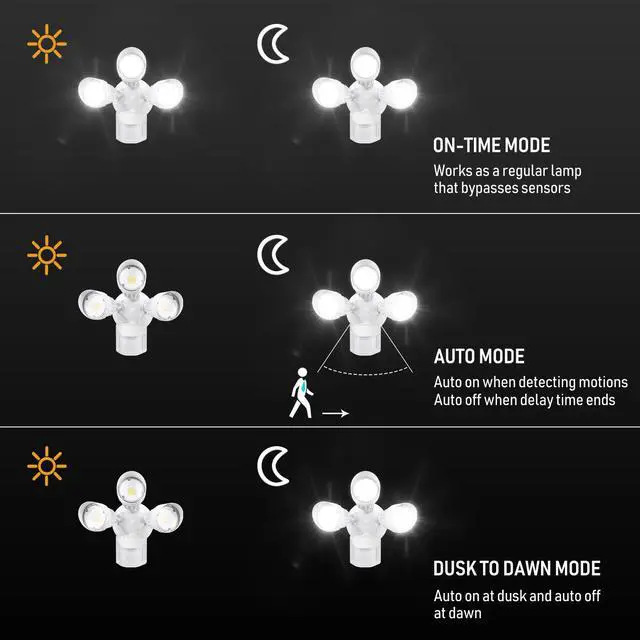 There are three different modes of use: On time, motion detection and dusk to dawn. Whether you want the lights to turn on only when movement is detected, or turn on automatically at dusk and off automatically at dawn, this safety light has everything you need.