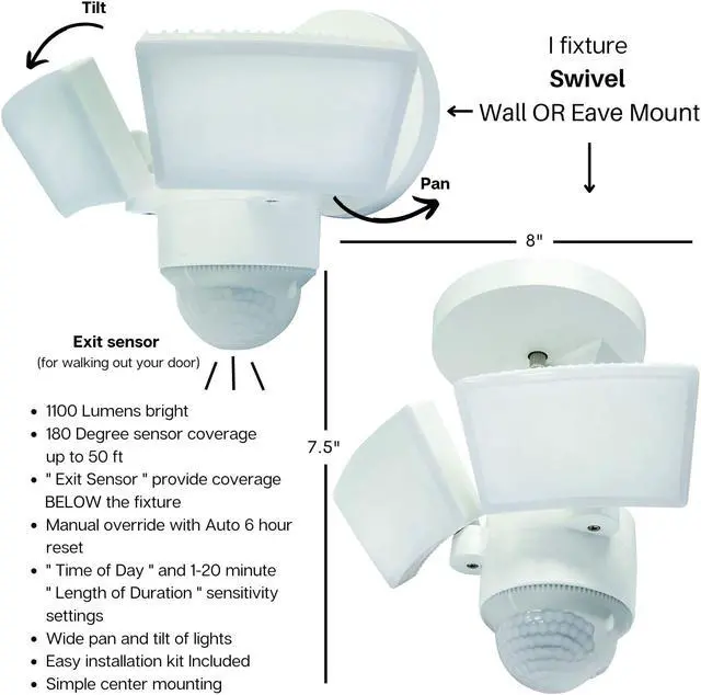 Proper lighting is a first good deterrent. Dual Mounting - Unique swivel design allows mounting the weatherproof fixture as a wall mount OR eave mount. Maximum flexibility - Individual head and total body adjustment maximize the lighting coverage. Easy Installation - With the easy install mounting kit, you'll be up and running in no time. It's safe and simple. You're in control with the time-on and sunlight sensitivity adjustments based on your individual needs. Perfect for any residential or commercial lighting sites, work sites, and job sites. home, shed, barns, workshops, she-shed, tiny homes, storage, patio, tents, storage, and more!