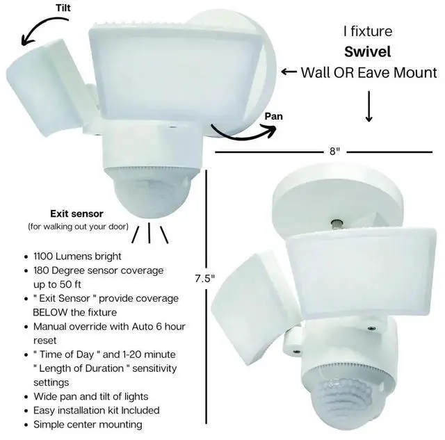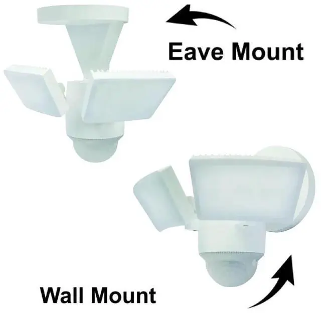 Proper lighting is a first good deterrent. Dual Mounting - Unique swivel design allows mounting the weatherproof fixture as a wall mount OR eave mount. Maximum flexibility - Individual head and total body adjustment maximize the lighting coverage. Easy Installation - With the easy install mounting kit, you'll be up and running in no time. It's safe and simple. You're in control with the time-on and sunlight sensitivity adjustments based on your individual needs. Perfect for any residential or commercial lighting sites, work sites, and job sites. home, shed, barns, workshops, she-shed, tiny homes, storage, patio, tents, storage, and more!