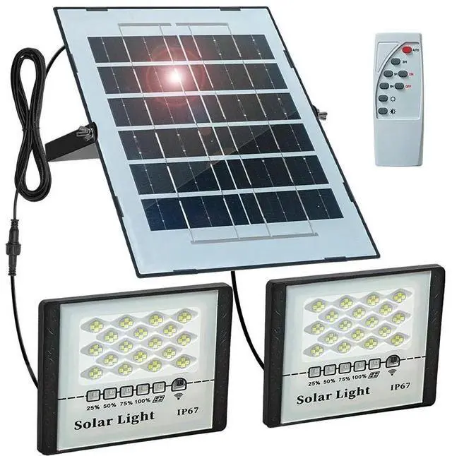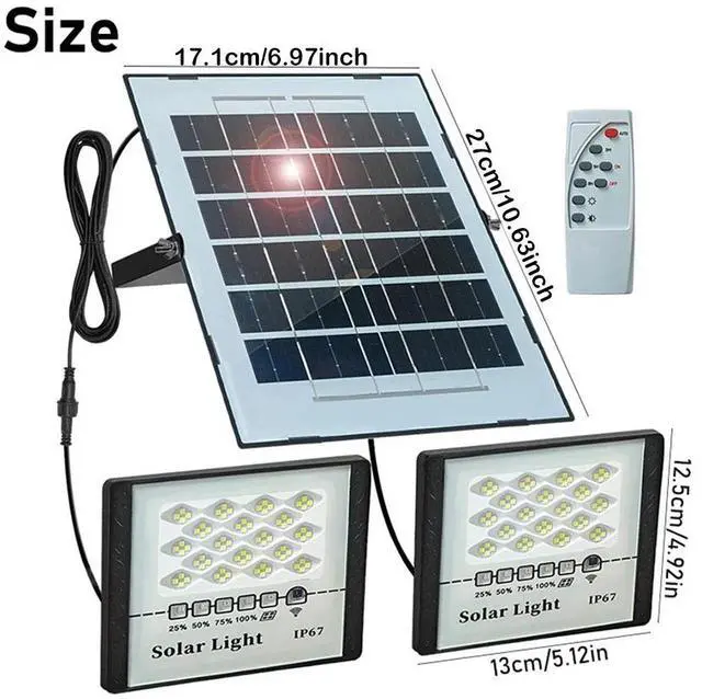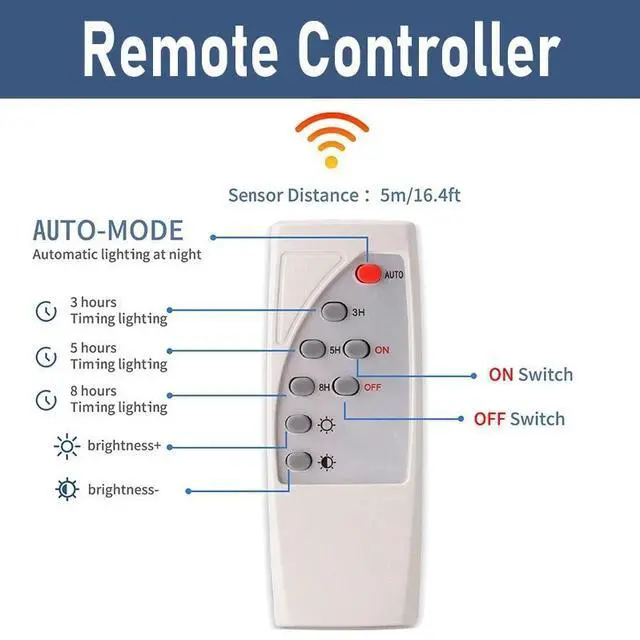 Remote Control & Battery Indicator: This two solar powered light is controlled by remote control and the remote control distance up to 16.4ft (5m), brightness adjustable, 3 / 5 / 8 hours timing mode and 100% / 75% / 50% / 25% battery indicator.