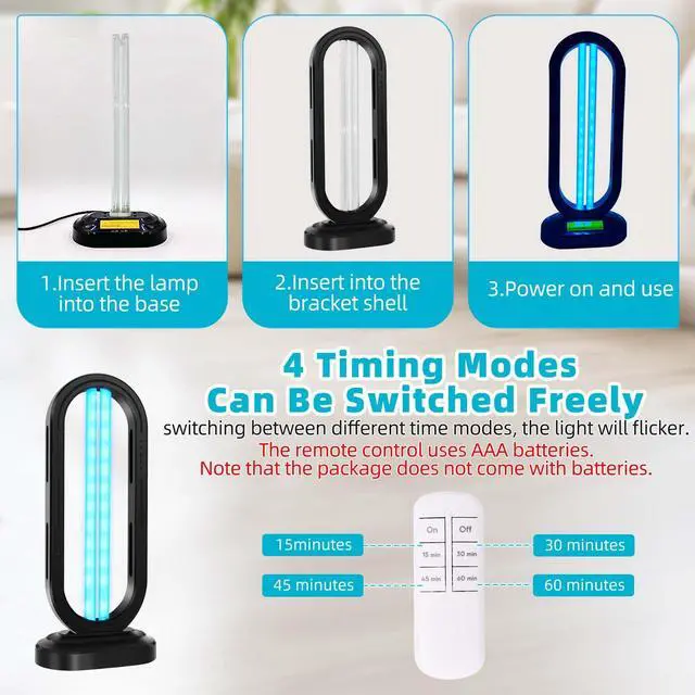 Convenient Timing: The UV light sanitizer has 4 timing modes, the remote control uses AAA batteries. (Batteries are not included in the package.) It can be timed by remote control for 15/30/45/60 minutes.