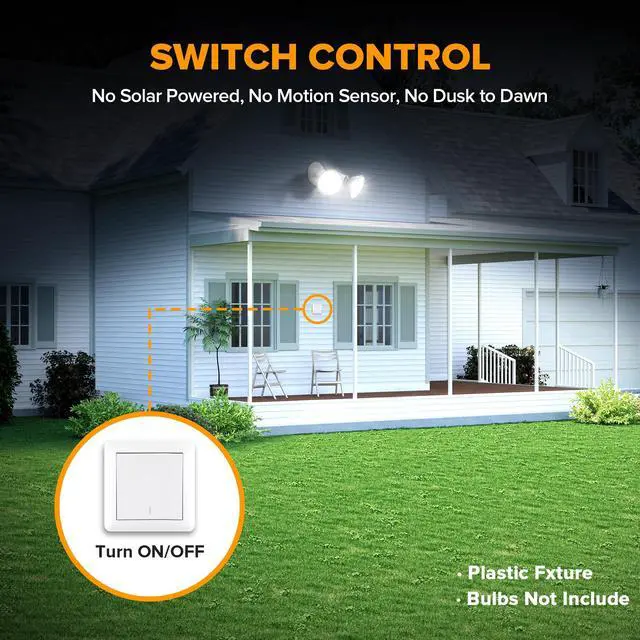 SWITCH CONTROLLEDThis plastic exterior flood lights can be turned on/off only by wall switch. Hardwire connection, NO motion sensor, NO solar powered, NO dusk to dawn