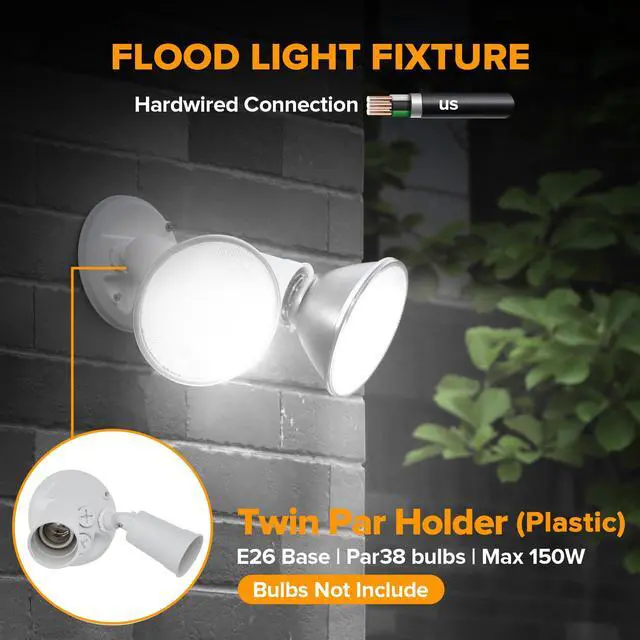 BULB REQUIREMENTSThis waterproof exterior security lights requires two Par38 E26 base bulbs (Max 150 Watt each, NOT Included). Compatible with Par38 incandescent and LED bulbs. You can choose different bulbs by your preference to create beautiful lighting atmospheres for your family