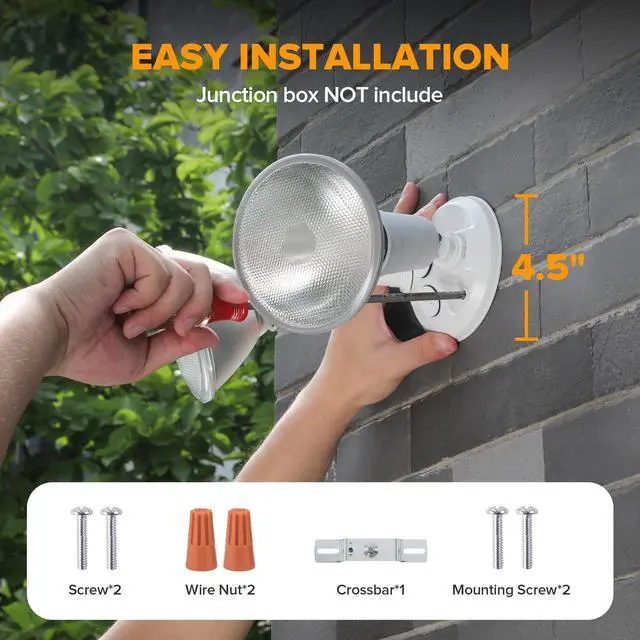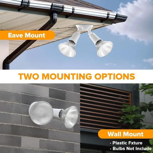 TWO MOUNTING OPTIONSThis plastics outdoor flood lights fixture is designed for eave or wall mount, includes all mounting hardware for quick installation. Suitable for outside use in porch, backyard, front door, garage, driveway, walkway, step, etc