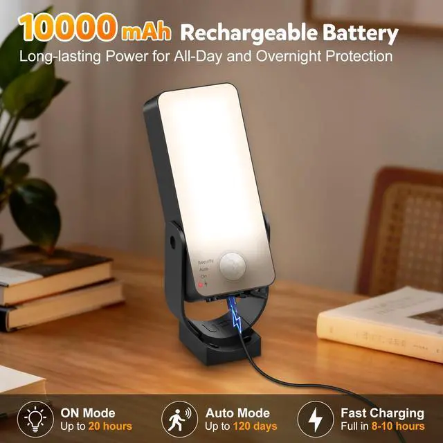 10000mAh Rechargeable Outdoor Light: HANDSONIC battery operated motion sensor light with 10000mAh battery, Up to 120 days of light after just one charge (with 10 motions per day). In the on mode, it can stay on continuously for up to 20 hours. Unlike solar lights, this outdoor battery powered motion sensor light for outside provides consistent brightness even on cloudy days, in shade, or during winter. Fast charging via USB-C in just 810 hours. No frequent battery changes simple and durable.